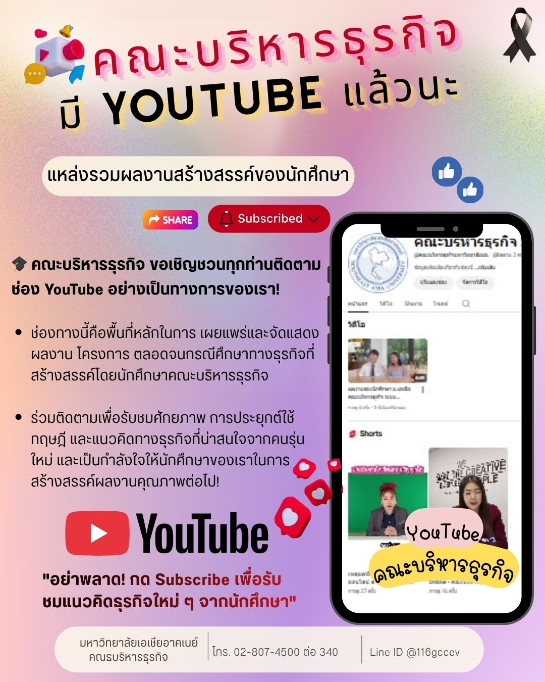 ช่อง YouTube คณะบริหารธุรกิจ อัปเดตคลิปใหม่ ๆ ให้ได้รับชมอย่างต่อเนื่อง! เราพร้อมเป็นเวทีให้นักศึกษาของเราโชว์ศักยภาพการเป็นนักธุรกิจรุ่นใหม่ ผ่านการทำคลิปสัมภาษณ์เจ้าของร้าน การวิเคราะห์ธุรกิจ และการนำเสนอที่น่าติดตาม